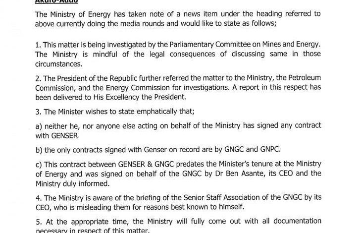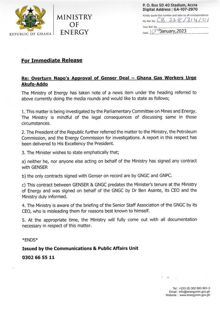 In a separate statement on January 10, 2023, the Energy Ministry, stated, “The Minister wishes to state emphatically that neither he nor anyone else acting on behalf of the Ministry has signed any contract with GENSER. The only contracts signed with Genser on record are by GNGC and GNPC”.