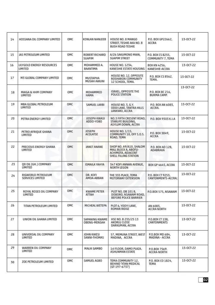 The rest are Petro Afrique Ghana Limited; Precious Energy Ghana Limited; Q8 Oil (Gh.) Company Limited; Rigworld Petroleum Services Limited; Royal Roses Oil Company Limited; Titan Petroleum Limited; Union Oil Ghana Limited; Universal Oil Company Limited; Warren Oil Company Limited, and Zoe Petroleum Limited.